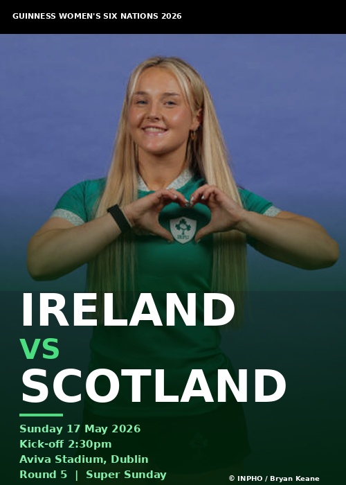 Ireland v Scotland Guinness Women's Six Nations Sunday 17 May 2026 · 12:00 AM Tullamore Rugby Club Sport